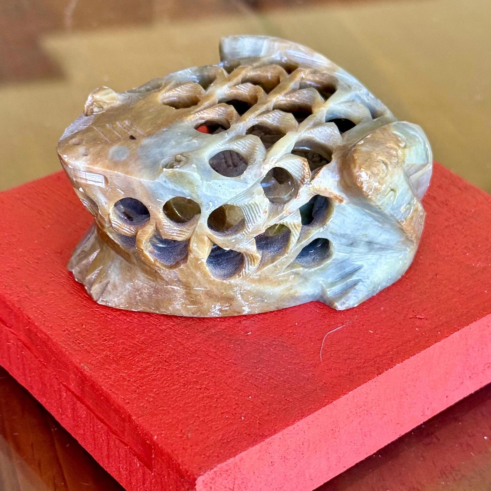 This vintage hand carved stone fertility frog figure/paperweight is a unique and intricately designed piece made from soapstone. The intricate details of the frog inside the larger frog figure give it a sense of depth and craftsmanship that is truly captivating. This piece would make a great addition to any collection or as a standalone decorative item, showcasing the beauty of nature and artistry in a single piece.