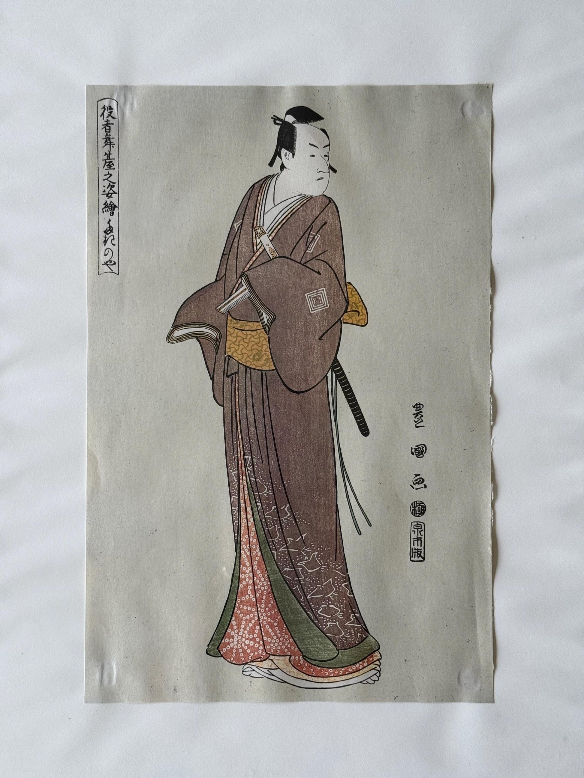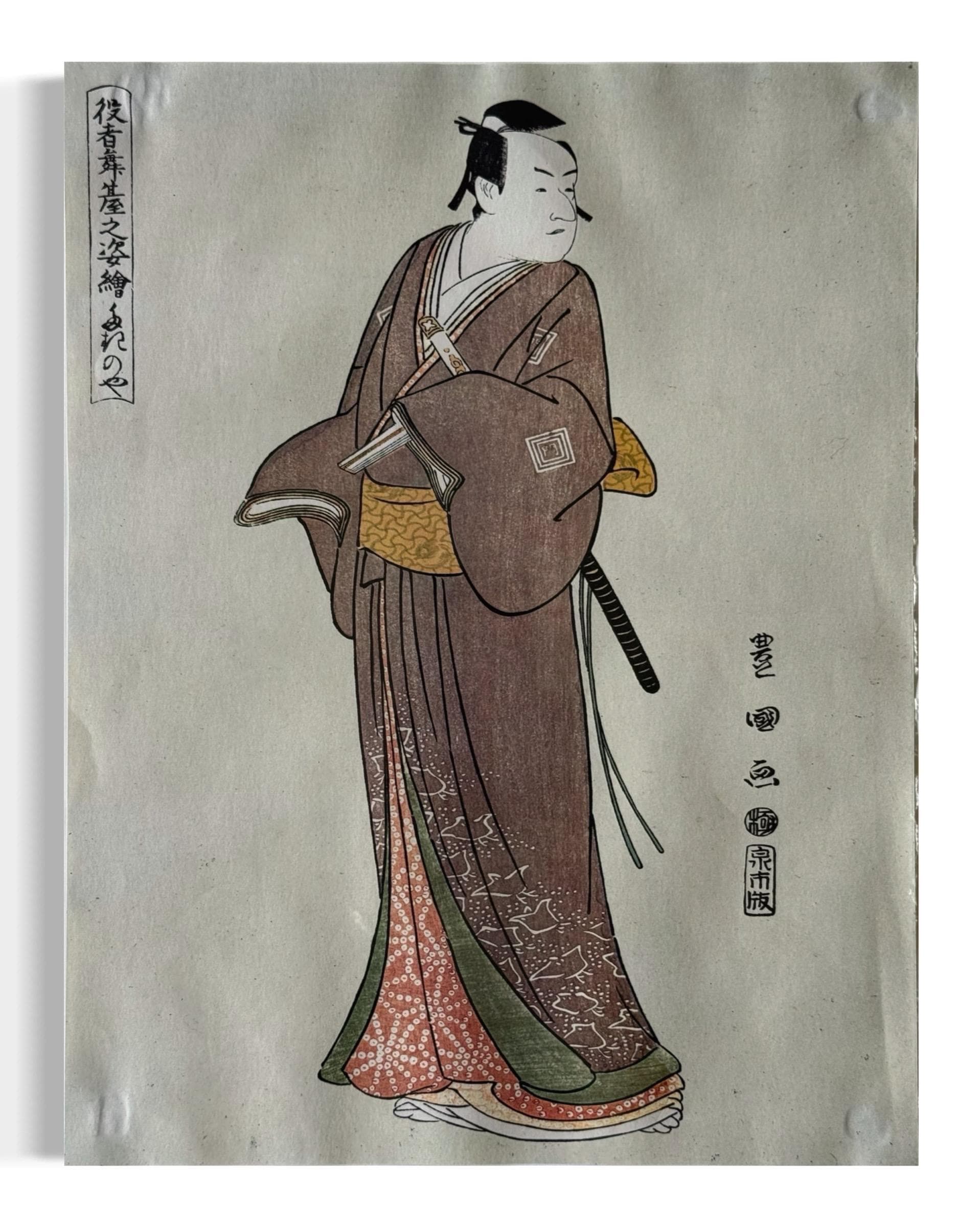 Samurai A standing figure of the actor Ichikawa Monnosuke, from the series Yakusha butai no sugata-e, [Pictures of Actors on the Stage], signed Toyokuni ga, kiwame seal, published by Izumiya Ichibei, very good impression and colour, mica in the background, Hayashi Tadamasa.