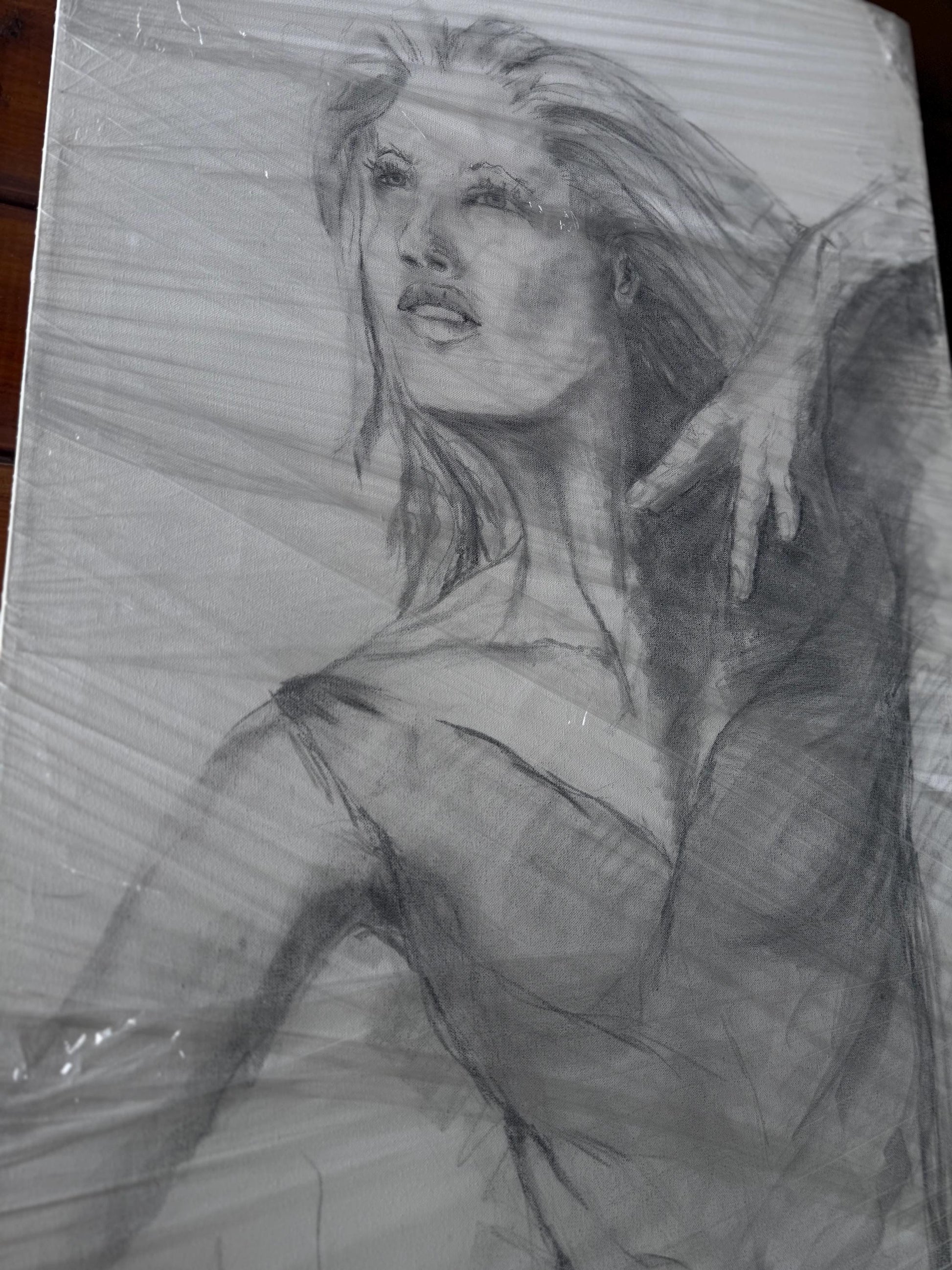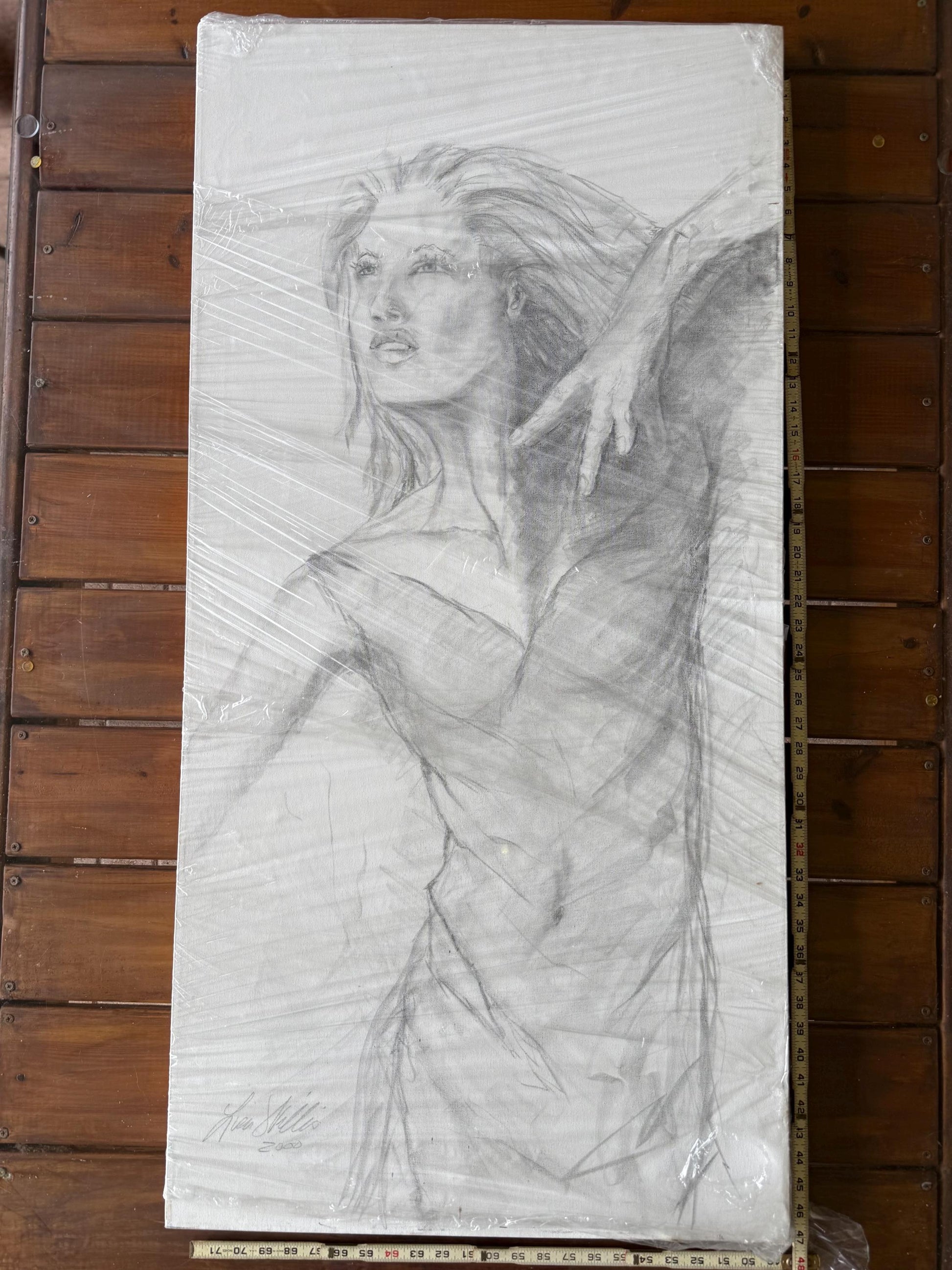 48x25in. This is an original drawing signed by the artist "Kim Skills" and dated 2000. It is a large portrait painting of a woman, done in oil on canvas. The style is portraiture, and the theme is a Lady. This artwork is a unique piece created by the artist in the year 2000, showcasing their skills and style in depicting a woman's portrait.