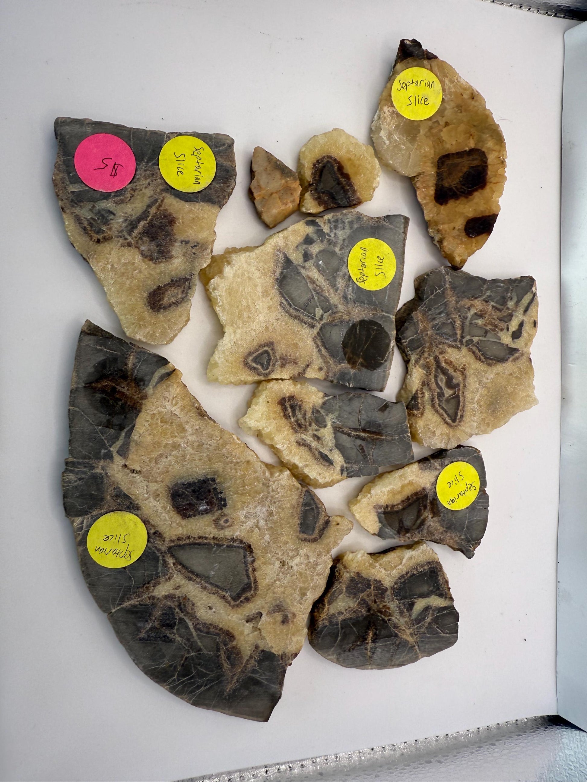 This set of top grade septarian slabs features fine mineral crystals rock specimens in a natural point shape. Each slab showcases the unique beauty of septarian crystals, making it a desirable addition to any crystal collection. Perfect for enthusiasts of rocks, fossils, and minerals, these slabs are sure to impress with their intricate patterns and natural formations. Ideal for display or for use in crystal healing practices, this set is a valuable and visually stunning find for collectors.