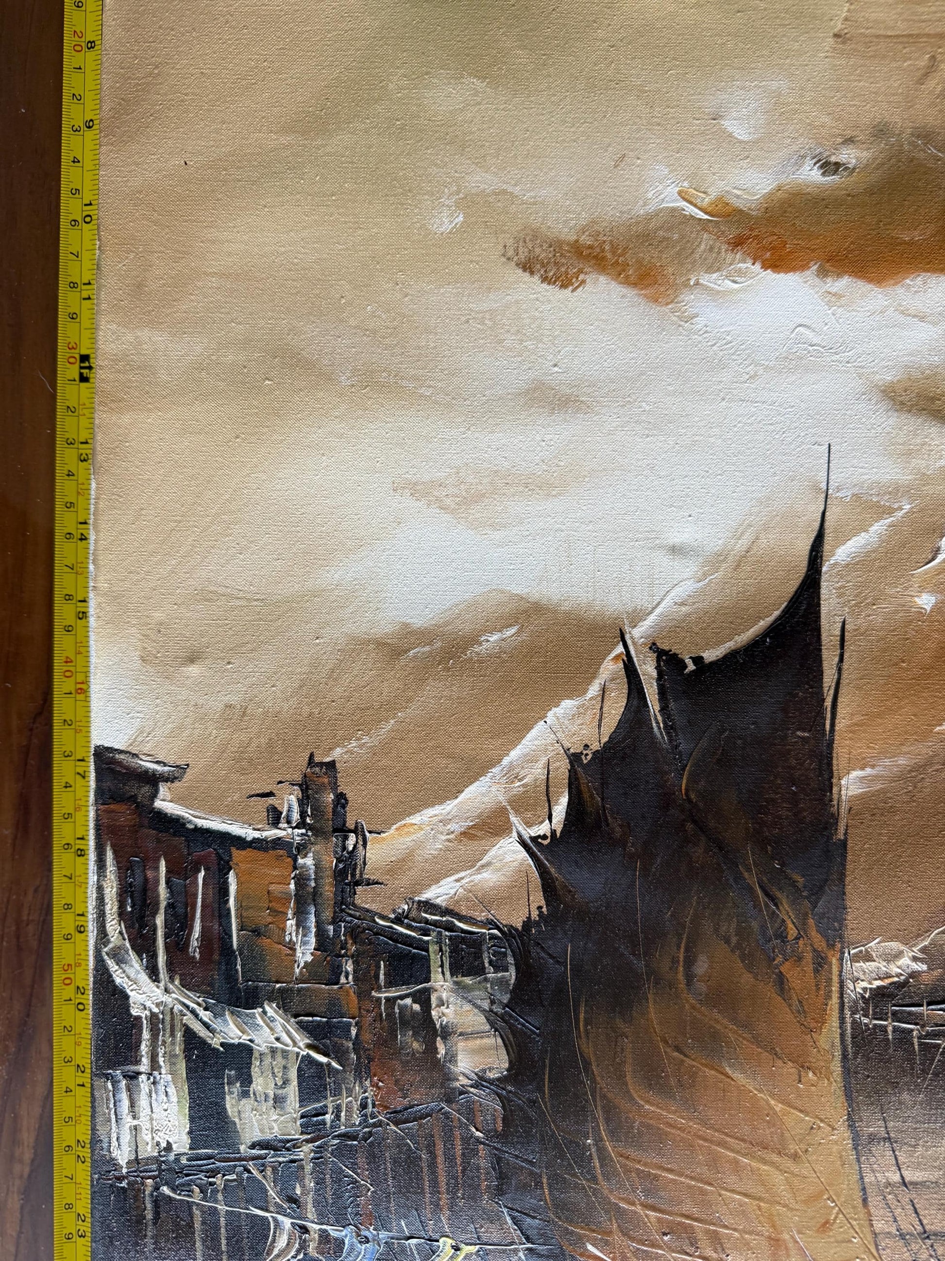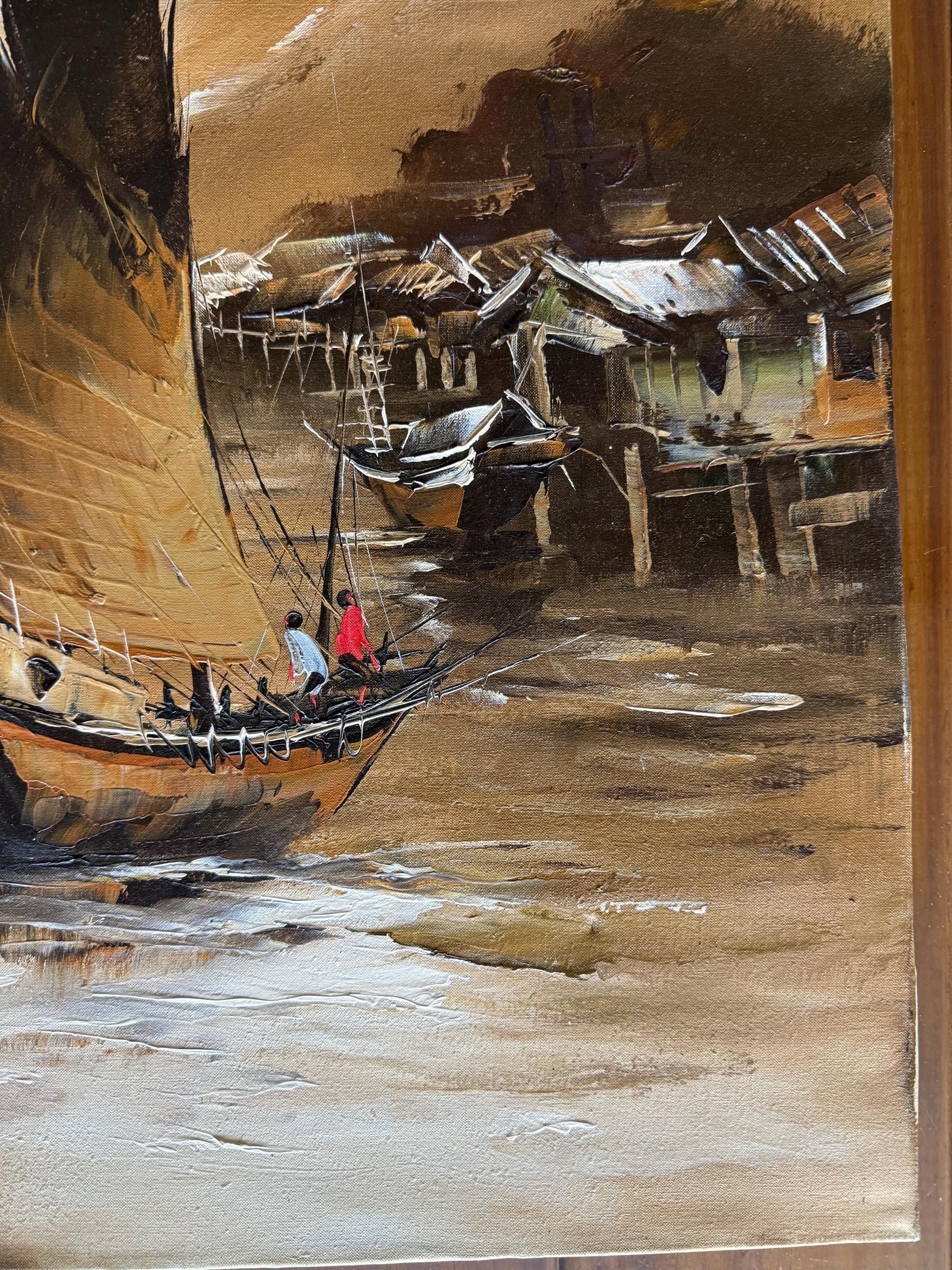 A Signed Original Painted Canvas Chinese Sail Boat Ship Shrimp Harbor Scene Art