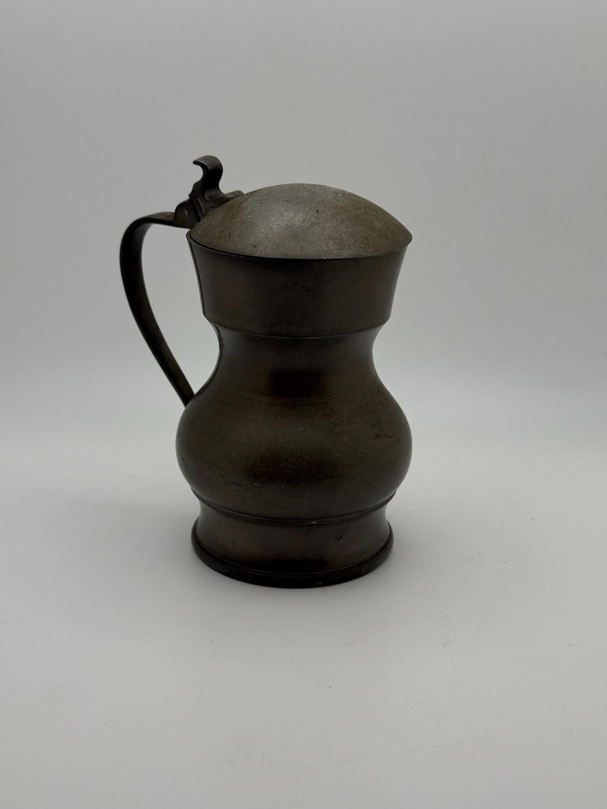 This product is a small French silver etain lidded wine jug cup, made of pewter and handmade in France. It is a fine vintage art piece that exudes elegance and charm. The craftsmanship and materials used in this cup make it a unique and special addition to any collection or a perfect gift for wine enthusiasts or collectors.