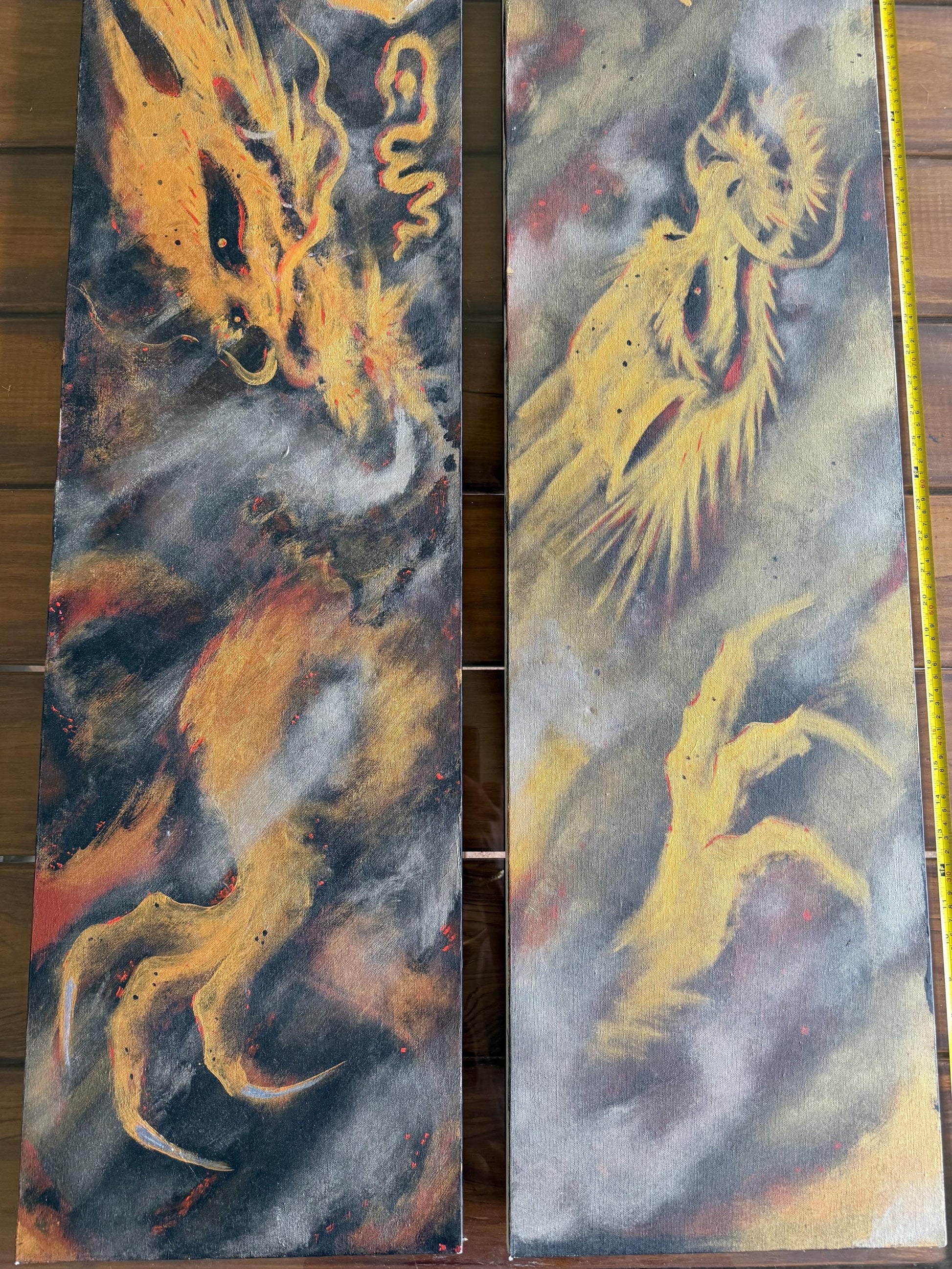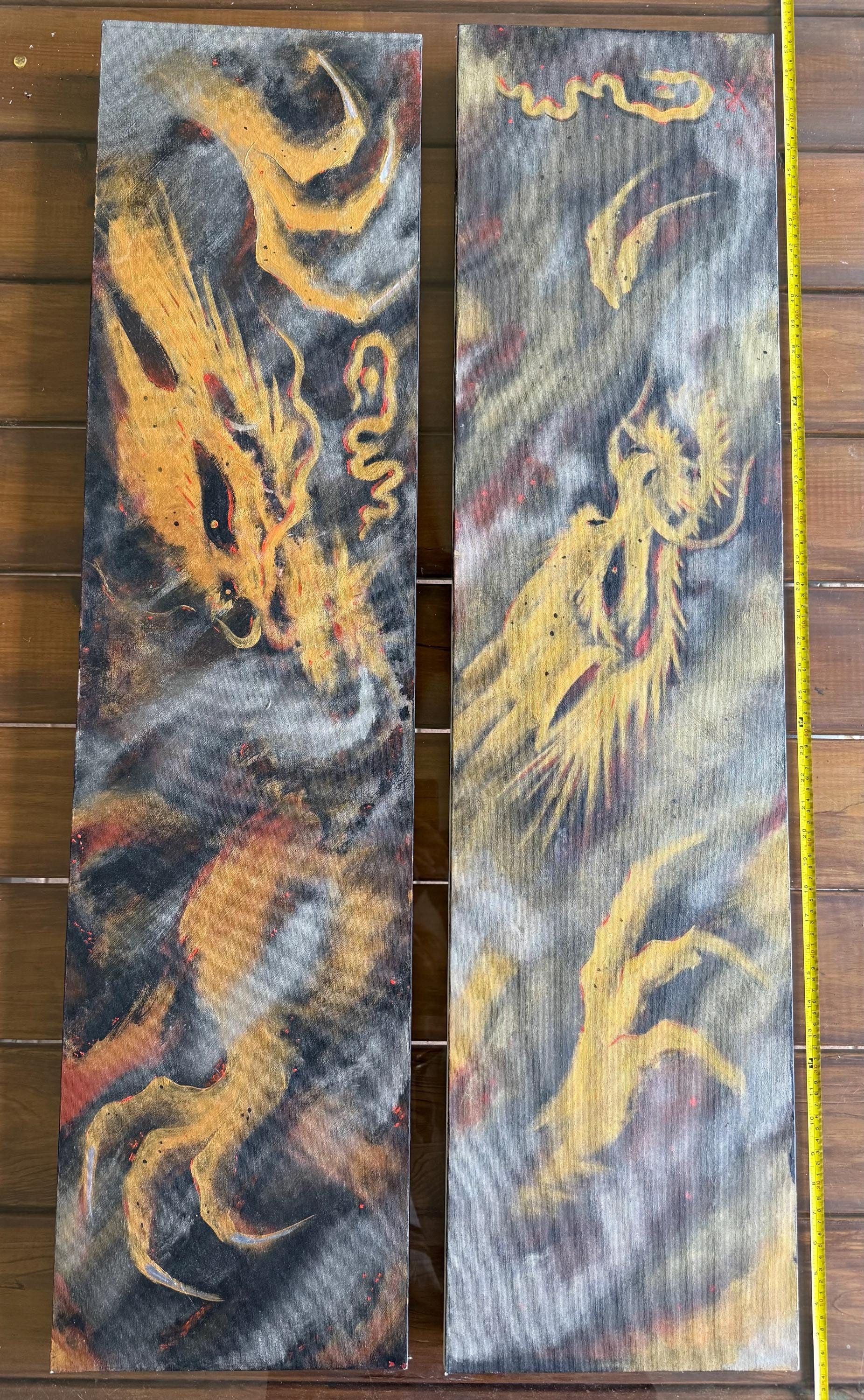 A Spray Painted Canvas Original Art Signed Metallic Gold Silver Smoking Dragon