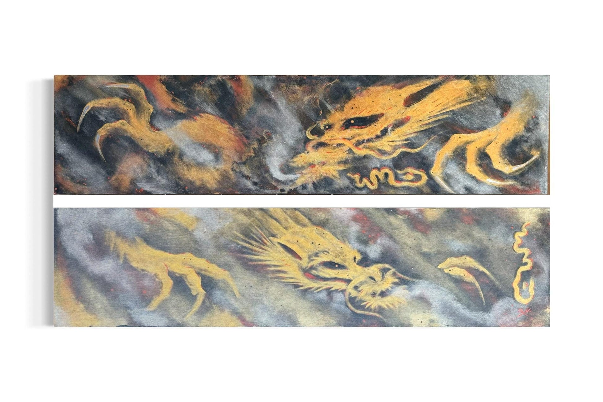 This is a unique and handmade smoking dragon spray paint art painted on canvas by a talented artist. The artwork features a metallic gold and silver color scheme, with a graffiti art style. It measures 40 inches in length and 10 inches in height, and is signed by the artist. This one of a kind (OOAK) piece is an original creation, perfect for adding a touch of street art flair to any space. Made in the United States, this artwork is a stunning representation of contemporary artistry.