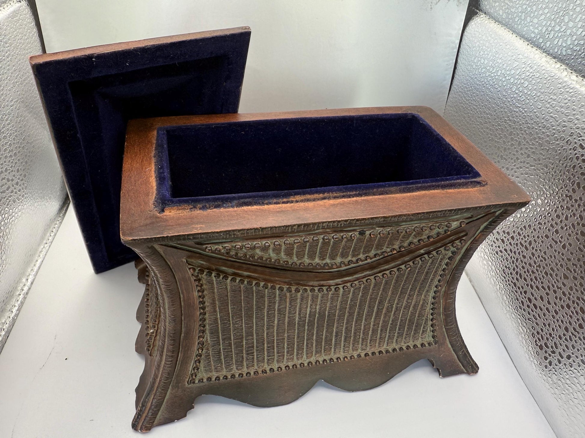 A vintage wooden oriental style jewelry box with suede lined inside interior