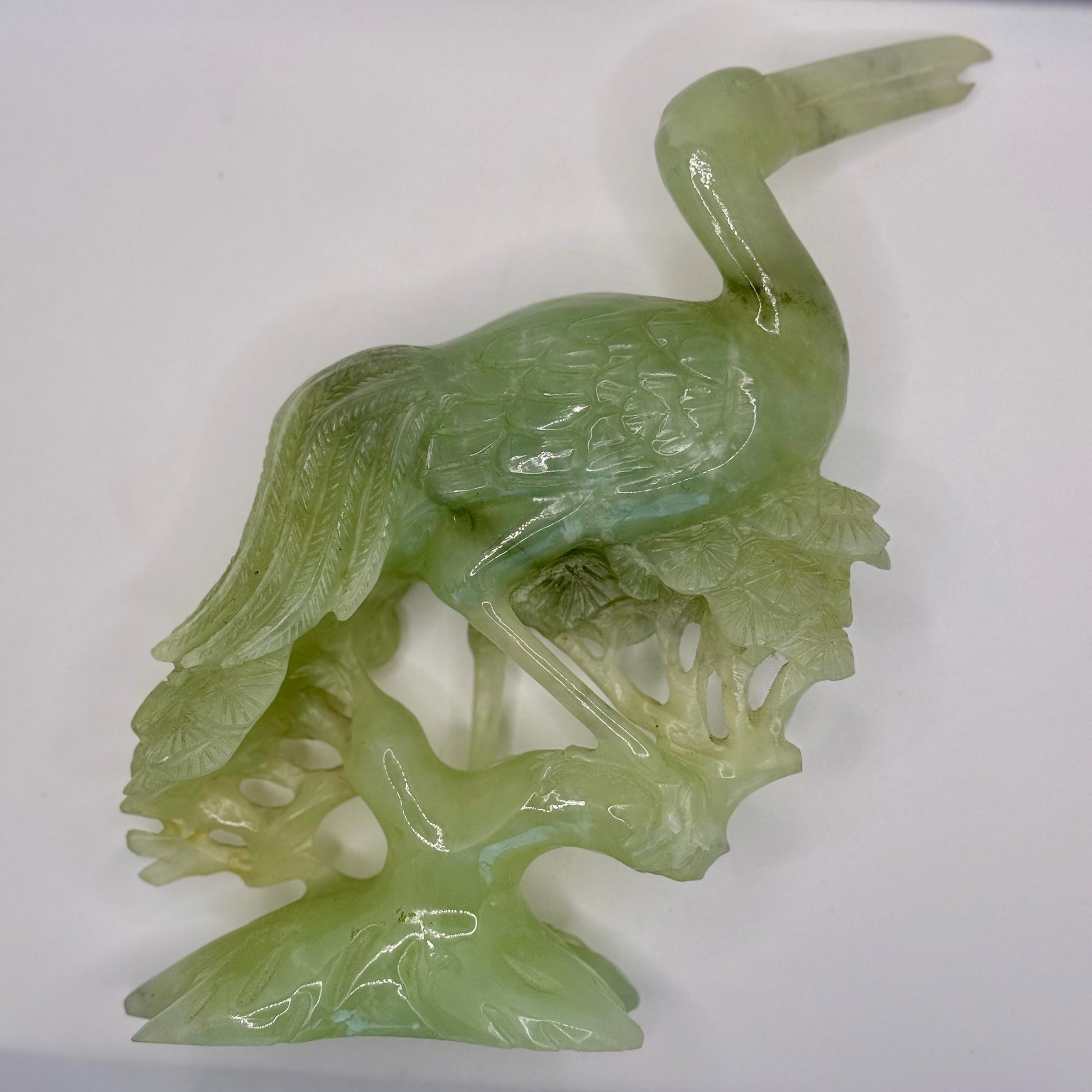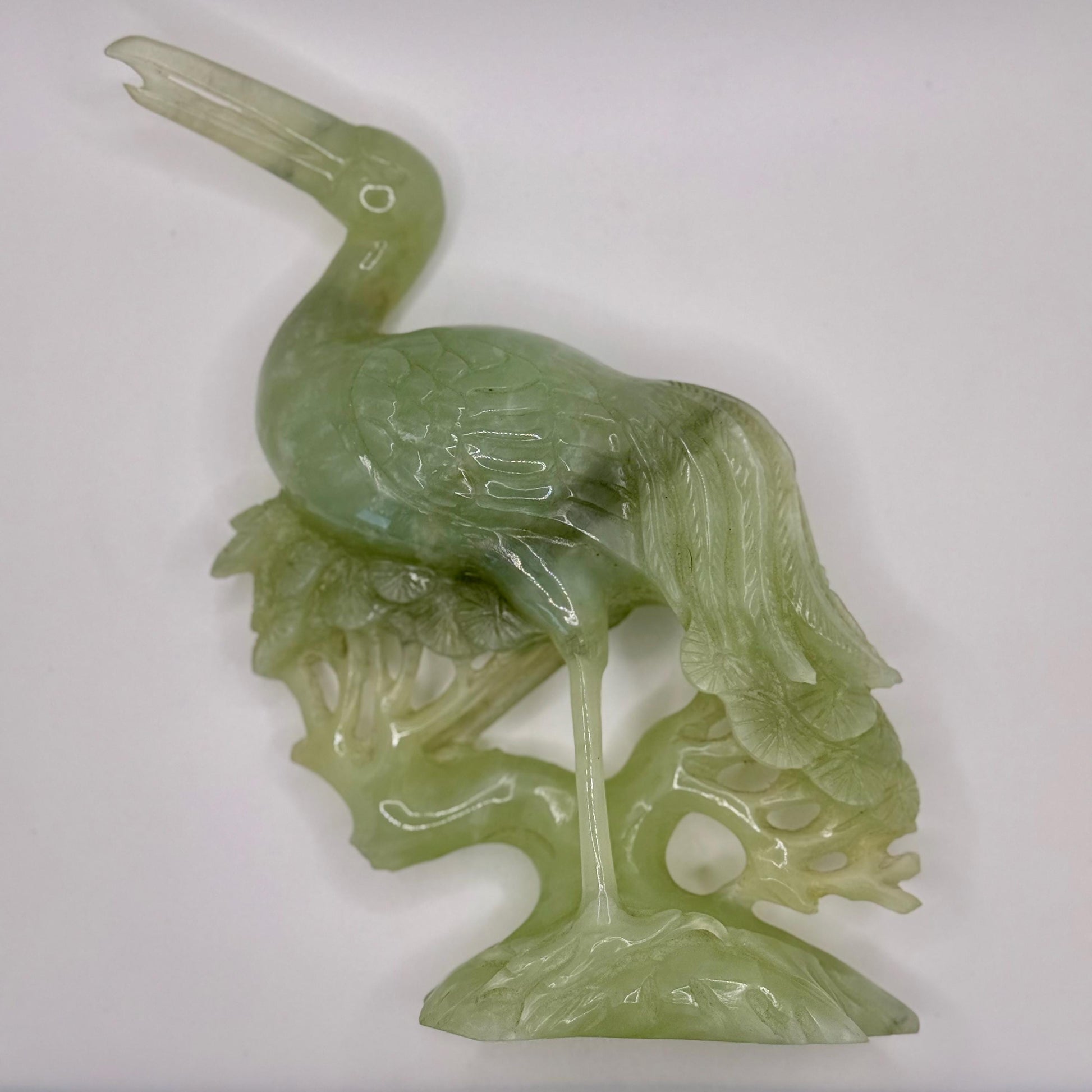 Antique Chinese Hand-Carved Light Green Jade Crane Bird Prunus Flower Sculpture Art