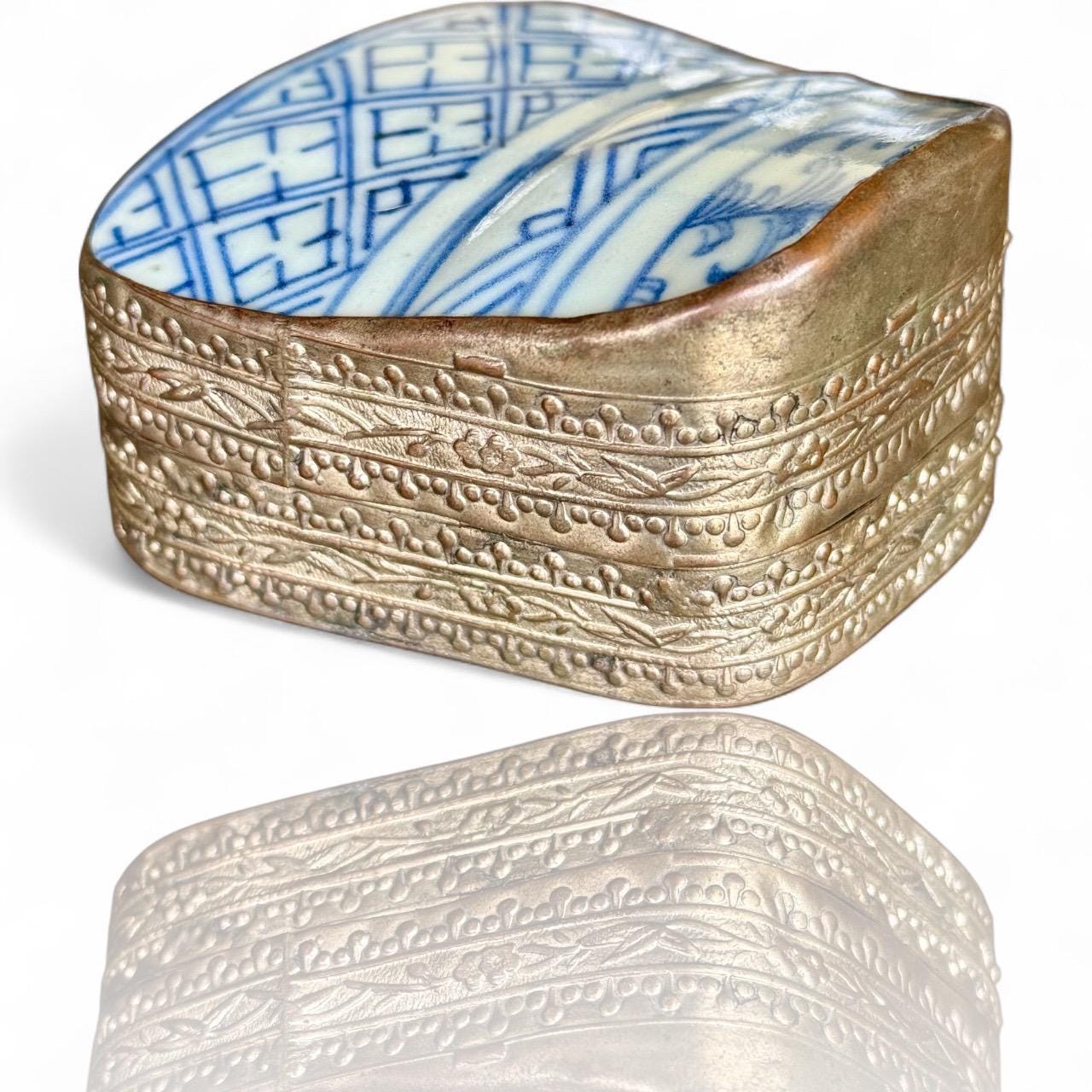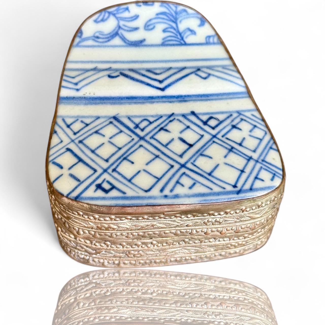 Antique Chinese Qing Dynasty Blue White Porcelain Shard Silver White Metal Box